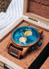 Questo cronografo in legno è un capolavoro di artigianalità, un mix di natura ed eleganza. Un quadrante celeste come il cielo, protetto da un vetro hardlex (resistente agli urti e ai graffi), fa da sfondo a lancette dorate e a due sub-quadranti azionabili tramite pulsanti laterali per la misurazione di secondi e minuti. Un indicatore del giorno del mese completa il design elegante e funzionale.